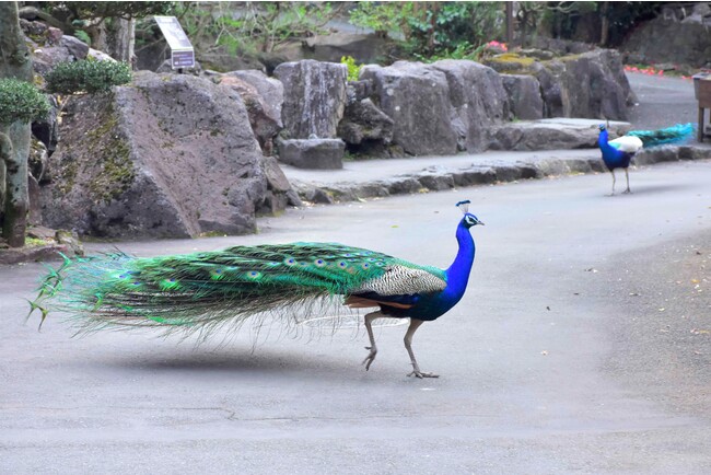 伊豆シャボテン動物公園では、放し飼いのクジャクたちが「ディスプレイ」と呼ばれる求愛行動を始め、雄が美しい飾り羽を広げて雌にプロポーズしている姿を園内のあちらこちらでみることができます。