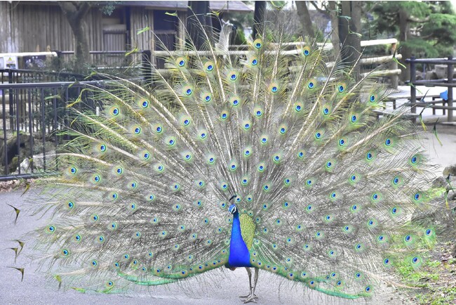 当園のクジャクは1961年より園内で放し飼いされ、現在、園全体で60羽(オス30羽、メス30羽)が暮らしています。