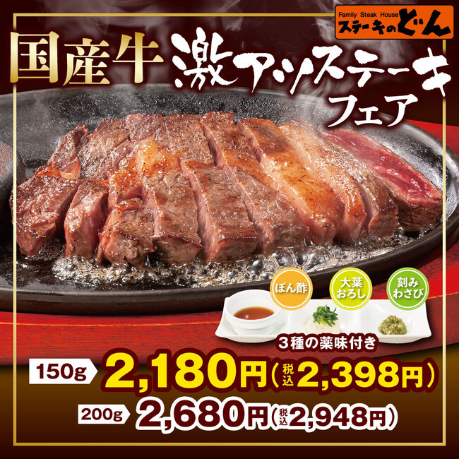『ステーキのどん』全店で【国産牛激アツステーキフェア】を開始!!国産牛の風味とうま味でプレミアムな「激アツ」体験。2023年3月27日(月)から全店60店舗で販売。