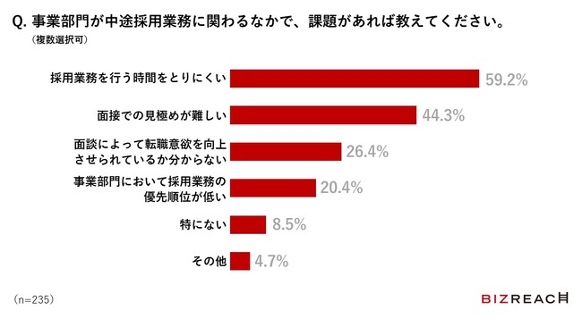 既に、多くの大手企業様において部門主導の採用体制が実践されていますが、これまで中途採用に関わってこなかった人事以外の社員に採用にコミットしていただくにはさまざまな課題があることがわかっています。今回の調査結果にもありましたように、採用業務を行う時間や、面接・面談における候補者の転職意欲向上に向けた働きかけや見極めが難しいといった課題です。ビズリーチでは事業部門を対象に、中途採用に関する市況感や、この時代における候補者との適切なコミュニケーションの取り方を理解していただくための「面接官トレーニング」などをご提供しており、日系大手企業を中心にご利用いただく機会が増えています。