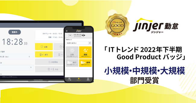 jinjer株式会社(本社:東京都新宿区、代表取締役:桑内 孝志)が提供する勤怠管理サービス「ジンジャー勤怠」は、法人向けIT製品・サービス比較サイト「ITトレンド」(本社:東京都渋谷区、代表取締役社長:齊藤 和馬)が選出する「ITトレンド 2022年下半期 Good Productバッジ」シフト管理・人員計画(WFM)の 小規模・中規模・大規模部門を受賞したことをお知らせします。
