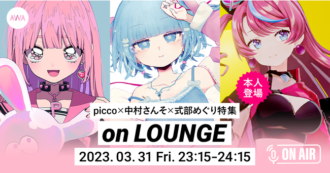 AWA株式会社(本社:東京都港区、代表取締役CEO:冨樫晃己)が運営する、サブスクリプション型(定額制)音楽ストリーミングサービス「AWA(アワ)」は、2023年3月31日(金) 23:15~24:15の1時間に渡り、無料で誰でも参加できるオンライン空間「ラウンジ」で、ネットシーンで活躍する「picco」「中村さんそ」「式部めぐり」が音声とチャットで参加するAWAラウンジを開催いたします。