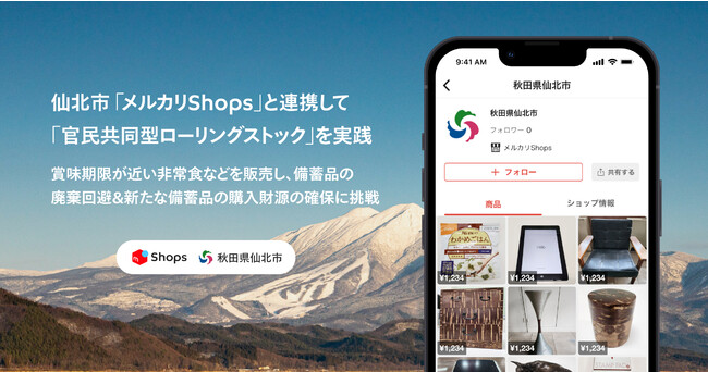『官民共同型ローリングストック』とは、自治体などの組織が抱えている備蓄品をネットショップで販売し、売上金を次の備蓄品の購入資源に充てることで、組織における「ローリングストック」を可能にする新たな備蓄の方法です。これにより、組織は備蓄品の廃棄削減と新たな備蓄品の財源確保を両立できるだけでなく、消費者にとっても賞味期限が近い商品を通常よりも低価格で購入することができます。なお、『官民共同型ローリングストック』は仙北市と「メルカリShops」が開発し、全国で初めて実施する取り組みです。仙北市は2013年と2022年に大雨被害を受けており、防災対策に積極的に取り組んでいます。