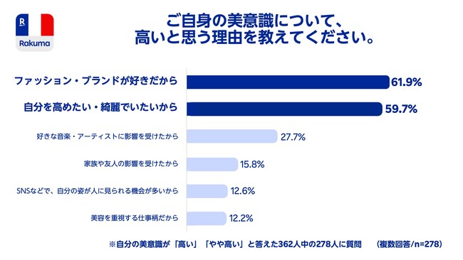 自分の美意識が「高い」、「やや高い」と答えた278人に「その理由」について質問したところ、「ファッション・ブランドが好きだから」(61.9%)が最多、次いで「自分を高めたい、綺麗でいたいから」(59.7%)、「好きな音楽・アーティストに影響を受けたから」(27.7%)、「家族や友人の影響を受けたから」(15.8%)、「SNSなどで、自分の姿が人に見られる機会が多いから」(12.6%)、「美容を重視する仕事柄だから」(12.2%)という結果でした。