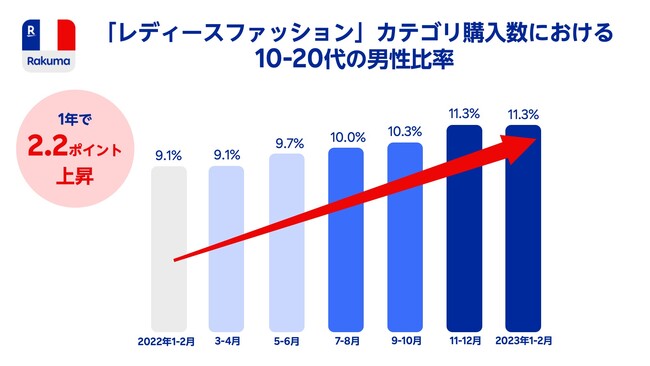 「楽天ラクマ」では、10代・20代による「レディース」カテゴリの購入取引数において、男性ユーザーの比率は2022年1月・2月の9.1%から2023年の同時期では11.3%となり、2.2ポイント上昇しています。
