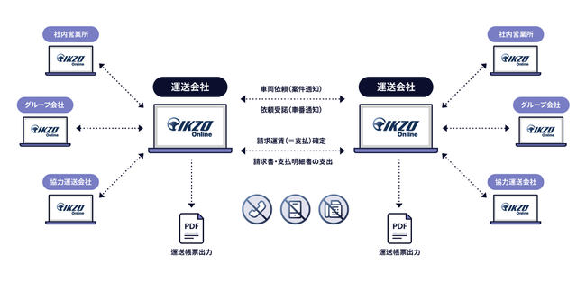 輸送依頼にあわせトラックとドライバーの割当をおこなう配車業務のデジタル化により業務を効率化する「IKZO Online」が、社内の営業所だけでなく、荷主と運送会社がオンラインでつながります。車両依頼・車番連絡・運賃の突き合わせなどの業務が「IKZO Online」上で完結できるほか発注業務をオンライン化し、荷主・運送会社の双方で業務改善を実現します。