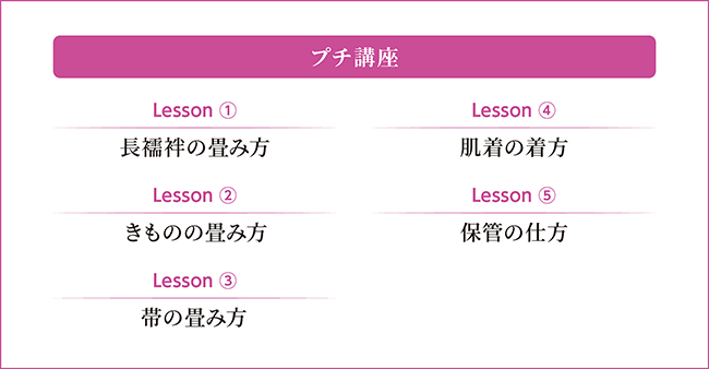 畳み方や保管の仕方など、着方以外の基本的な内容を全5レッスンに分けて説明しています。