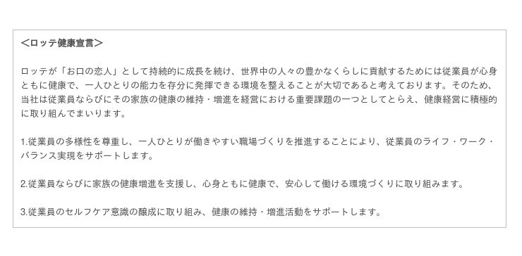 弊社は「ロッテ健康宣言」のもと、従業員とその家族が健康で充実した生活を送れるよう、健康経営に対する取り組みを今後さらに強化・推進してまいります。