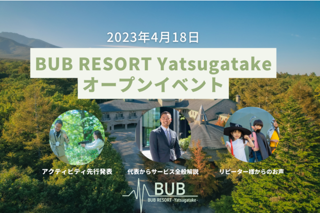 体験型グランピング施設BUB RESORT Chosei Village(千葉県長生郡)を運営する株式会社BUB(東京都品川区、代表取締役 一戸 悠人)が、2拠点目となるBUB RESORT Yatsugatake(山梨県北杜市清里)を2023年4月22日に開業します。「世界を体験で埋めつくす」ミッションから、八ヶ岳エリアの自然と文化を軸として体験にフォーカスをあてた独自の体験型グランピングサービスを提供しています。オープンを記念して、2023年4月18日にオープニングセレモニー・オープンイベントが行われます。