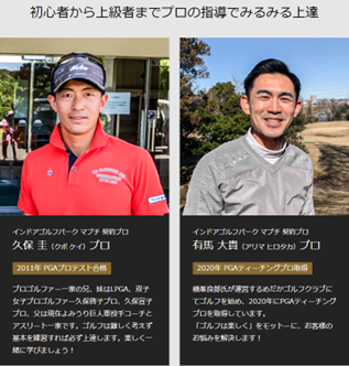 当店はマシンだけでなく実際にプロからのアドバイスがもらえるサービスも充実!当店契約プロが出勤中は月会費内でプロによるワンポイントレッスンが受け放題!その方のレベルやお悩みに合わせてピンポイントにアドバイスがもらえるので、最短で上達を目指せます!※マンツーマンレッスンやラウンドレッスンもオプションでご利用いただけます。 <契約プロ紹介>