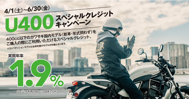 株式会社カワサキモータースジャパン(本社:兵庫県明石市、代表取締役社長:桐野 英子)は、4月1日(土)より400cc以下のカワサキモーターサイクル(コンペティションモデルを含む新車)を、カワサキ正規取扱店で購入時に実質年利1.9%でご利用いただける「U400 スペシャルクレジットキャンペーン」を開始いたします。