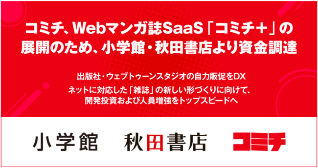 出版社・ウェブトゥーンスタジオ向けマンガSaaS*[1]「コミチ+」を展開する株式会社コミチ(代表取締役社長:萬田大作、所在地:東京都千代田区)は、業容拡大に向けて、株式会社小学館(代表取締役社長:相賀信宏、 所在地:東京都千代田区)及び株式会社秋田書店(代表取締役社長:樋口茂、 所在地:東京都千代田区)から資金調達を行います。
