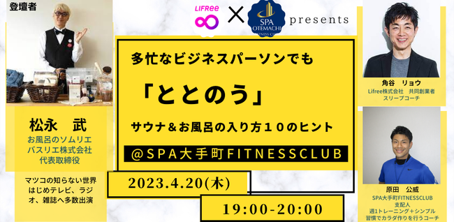 2023年4月20日(木曜日)に第一回目の開催となるLifree×SPA大手町によるwell-beingなトークイベントで、お風呂のソムリエ松永武が登壇します。都会のビジネスパーソンに向けて、お風呂やサウナで体調をととのえる方法などをお話しします。