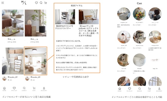 人気インフルエンサーが本当に使ってよかった商品を素敵なインテリア空間とともに写真を掲載します。レビューや関連商品を見て、その場で購入することができます。インフルエンサーごとのページもあるので、お気に入りのインフルエンサーが紹介する商品を一覧で見ることも可能です。