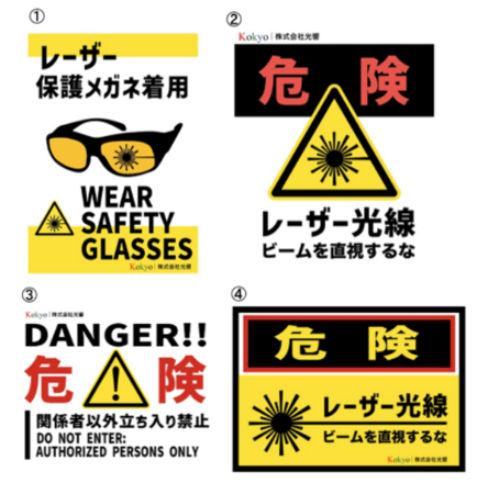 今回発売のレーザー標識の特長として、レーザー機器使用時における注意喚起を促すための文言や安全保護具の内容 を含めた4種類を用意しております。マグネットタイプの為、研究室や工場などにある鉄やスチールの扉への貼り付 け、取り外し、移動も容易です。サイズは A4 サイズを採用し、遠目からでも管理区域の存在がわかる仕様となって おります。お客様の希望仕様により文言の追加やカスタムが可能です。