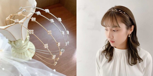 華やかさを演出するならビジューを使用したこちらの2タイプのカチューシャ。