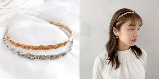 編み込み風の上品なデザインのカチューシャは程よいボリューム感があり、単品使いでもしっかりお洒落な印象に。