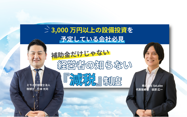 株式会社SoLabo(本社:東京都千代田区、代表取締役:田原広一)は、ミライズ税理士法人(本社:愛知県名古屋市、代表社員:金寛昇)と共同で、設備投資に活用できる減税制度を解説するセミナーを開催いたします。