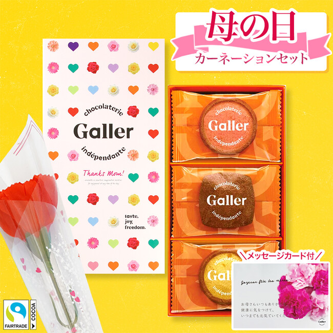ガレーのクーベルチュールチョコレートと香り高いバターを使用したオリジナルクッキー12枚入を母の日限定デザインのギフトスリーブケースにお入れしました。さらに、感謝を伝えるメッセージカード、カーネーション(フェイクフラワー)、手渡しに便利なガレー公式ショッパー袋がセットとなっております。※数量限定&なくなり次第終了