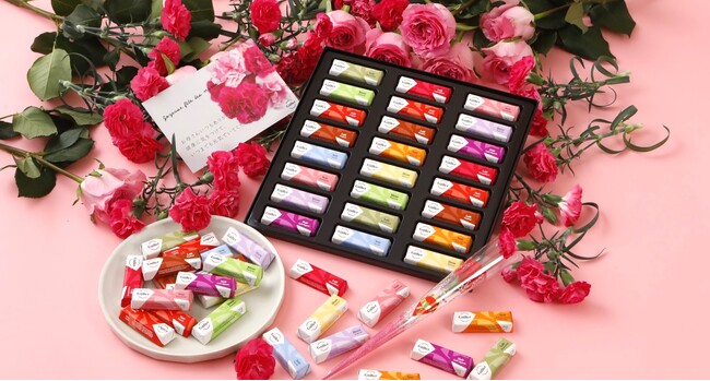 母の日限定デザインThanks Mom! スリーブケース付のミニバー24個入に、感謝を伝えるメッセージカードとカーネーション(フェイクフラワー)、手渡し用ギフトバッグがセットとなっております。