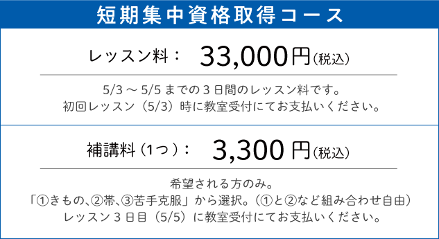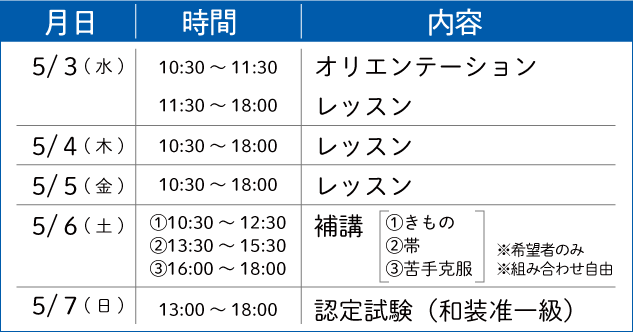 ※5月3日~5日の3日間でレッスンを行い、6日は希望される方のみ補講を開講いたします。