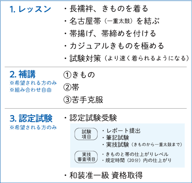 ※資格は必要ない、とりあえずきものを着られるようになりたいという方は、「3日間のレッスンのみの受講」、