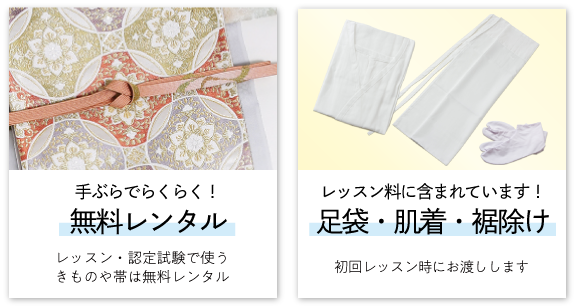 3日間の講座と、補講と認定試験(各1日)の計5日間という短期間できものの基礎が学べます。また全くの初心者の方でもきものが着られるようになり、一般財団法人日本和装協会の認定資格(和装准1級)取得まで目指せるチャンスです。授業で使用するきものや帯は無料でレンタル致します。また足袋等の肌着類も、レッスン料に含まれています。ご興味のある方は是非お申し込みください。