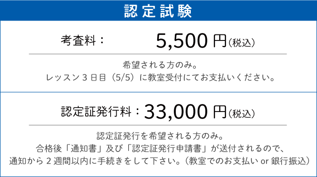 認定証発行料以外のレッスン料、補講料、認定試験考査料は全て教室での現金払いのみとなります。