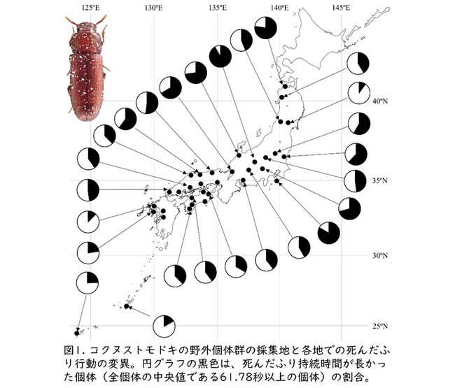 国立大学法人岡山大学(本部:岡山市北区)学術研究院環境生命科学学域の松村健太郎研究助教と宮竹貴久教授は、コクヌストモドキ(Tribolium castaneum)という昆虫を用いて、生息地の緯度と死んだふり行動の関係を調査しました。日本各地に設置されたコイン精米機から採集したコクヌストモドキの死んだふり行動を調べたところ、高緯度(北)の個体は低緯度(南)の個体よりも、死んだふりを高頻度で長い時間行うことが明らかになりました。