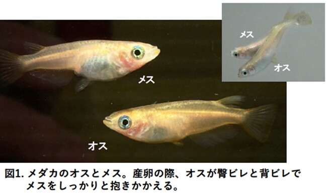 九州大学大学院農学研究院 国際農業教育・研究推進センター、農学研究院水族分子発生学研究室の荻野由紀子准教授を中心とする、京都大学 安齋賢特定准教授、基礎生物学研究所 渡辺英治准教授、亀井保博RMC教授、成瀬清特任教授、福井県立大学 八杉公基准教授、岡山大学理学部附属牛窓臨海実験所 片山侑駿助教(研究当時)、坂本浩隆准教授、広島大学 荻野肇教授、東京理科大学 宮川信一准教授、横浜市立大学 佐藤友美教授、井口泰泉特任教授らの研究グループは、真骨魚類の系統で特異的に起きた全ゲノム重複により、男性ホルモン(アンドロゲン)の作用を遺伝子発現に変換するアンドロゲン受容体遺伝子のコピー数が2つに増えたことに着目し、メダカ(図1)における2つの遺伝子コピーの役割について変異体を用いて詳しく比較しました。その結果、アンドロゲン受容体遺伝子が精子形成の役割を別の遺伝子に任せて、オスに特徴的な“かたち、体色、繁殖行動”に役割分担を進めて特殊化していったことを世界で初めて明らかにしました(図2)。