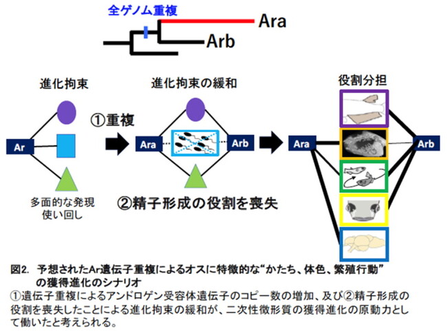 全ゲノム重複により2つに増えたアンドロゲン受容体遺伝子が、突然変異を蓄積して変化した結果、祖先遺伝子が持っていた精子形成の仕事を捨て、かつ2つの遺伝子コピーの間で他の仕事の分担を進めて特殊化していったことが明らかとなった。また、このことが真骨魚類の美しく長いヒレや華麗な交尾ダンスの進化につながり、多様化と繁栄をもたらしたことが示唆された。