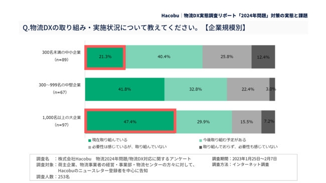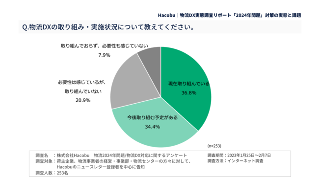 「運ぶを最適化する」をミッションに掲げる株式会社Hacobu(ハコブ、本社:東京都港区、代表取締役社長CEO 佐々木太郎、以下「Hacobu」)は、物流領域に関連する荷主企業及び物流事業者の経営、事業部、物流センターの方々を対象に、2023年2月、物流DXの取り組み状況に関する調査を実施しました。この度、その調査結果について『物流DX実態調査リポート~「2024年問題」対策の実態と課題』にまとめましたので、お知らせします。