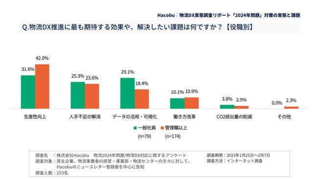 ■物流DXに期待する効果は「生産性向上」。一般社員は「データの活用・可視化」への期待も
