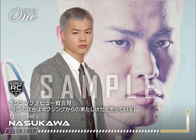 2023年2月13日に行われた、那須川天心選手のボクシングデビュー戦会見の様子がトレーディングカードに。那須川選手が同年4月8日に東京・有明アリーナで日本バンタム級4位の与那覇勇気選手を相手にスーパーバンタム級6回戦でのプロボクシングデビュー戦を行うことを発表し、その意気込みを語る勇姿を、会見で語られた言葉とともに「EPOCH-ONEトレーディングカード」に収録しました。歴史に残る会見の様子を収めたカードは臨場感さながら。那須川選手自身初の記念すべき公式トレーディングカードとしても記憶に残る1枚を、ボクシングデビュー戦と併せてお楽しみください。