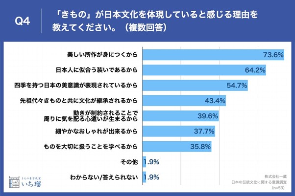 Q3で「きもの」と回答した方に、「Q4.「きもの」が日本文化を体現していると感じる理由を教えてください。(複数回答)」と質問したところ、「美しい所作が身につくから」が73.6%、「日本人に似合う装いであるから」が64.2%、「四季を持つ日本の美意識が表現されているから」が54.7%という回答となりました。
