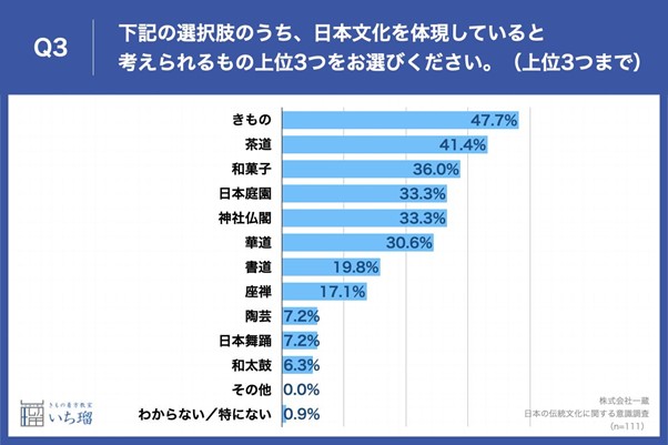 「Q3. 下記の選択肢のうち、日本文化を体現していると考えられるもの上位3つをお選びください。(上位3つまで)」と質問したところ、「きもの」が47.7%、「茶道」が41.4%、「和菓子」が36.0%という回答となりました。