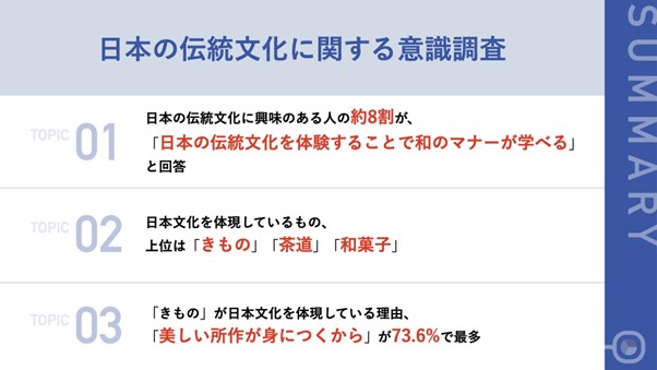 【日本の伝統文化に関する意識調査】 日本文化を体現していると思うもの、第1位「きもの」。日本の伝統文化を体験することで「和のマナー」や「四季の美しさ」を学べるとの声も