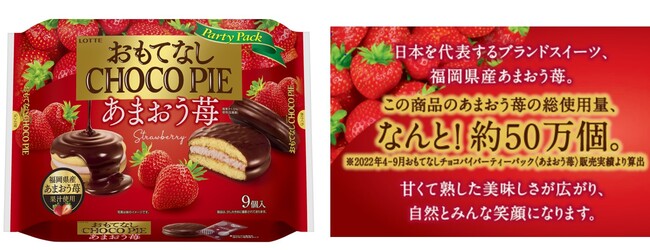 株式会社ロッテは、発売40周年を迎えるロングセラーブランドチョコパイの「おもてなしチョコパイパーティーパック〈あまおう苺〉」において、2022年度4月‐9月の期間、約50万個ものあまおう苺を使用しており、今後も地域応援を加速していくために継続販売予定です。
