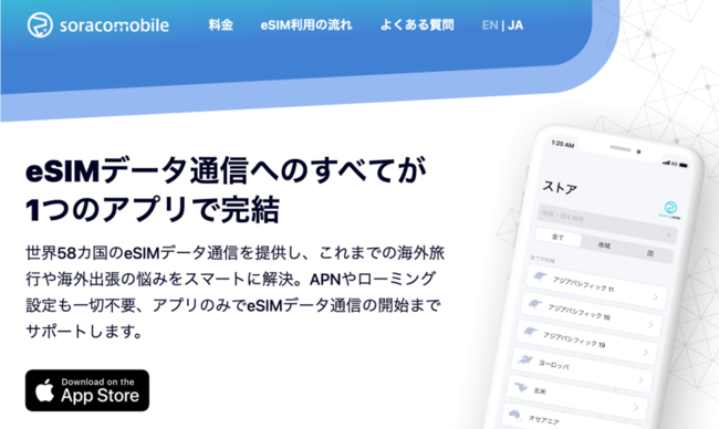iPhone/iPad向けeSIMデータ通信サービス「Soracom Mobile」は、iOSアプリの中でeSIMの購入から設定まで手間いらずで完結できます。日本はもちろん、アジア太平洋地域、ヨーロッパ、北米の各国プラン、周遊プランもご提供しており、海外旅行や出張にも最適です。