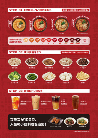 選べる米線のラインナップは一番人気且つ王道の「麻辣(マーラー)」、フレッシュな甘さと酸味に加えてスパイスの豊かな香りが楽しめる「番茄湯(トマト)」、焦がしスパイスの薫り高い風味がやみつきになる「煳辣(ウーラー)」、中国酢の酸味と辛味が楽しめる「三哥酸辣(サムゴーサンラー)」の4種です。具材は、牛赤身肉やほうれん草をはじめとした10種類の具材の中から2種類お選びいただき、ドリンクはレモンティー・ミルクティー・鴛鴦茶(えんおうちゃ)・コーヒーからお選びいただけます。また、新ランチセットをご注文いただたお客様限定で、通常250円の小皿料理「たたききゅうり」「黒きくらげ」や、人気No.1サイドメニューの「トーフェイ・チキン(2個)」が+100円でオーダー可能です。