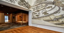 日本の美しい四季の中にある棚田を、細川護熙氏が墨絵で描いた作品「棚田の四季」。2m×1mの大きさの和紙60枚によって構成され、見る面や高さによって風景と四季が変わる表情豊かな作品です。米文化継承活動のシンボルとなる、天高8mの壮大な壁画です。