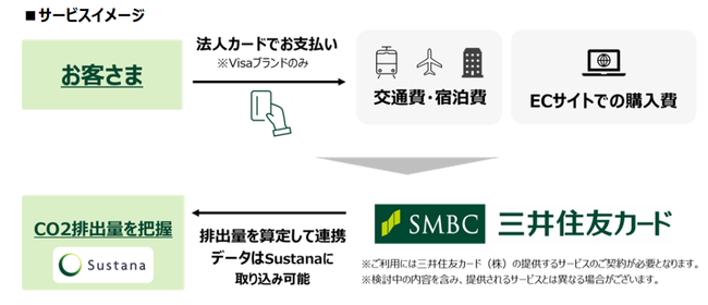 三井住友カードが発行する法人カードの決済データをもとに、企業のCO2排出量を算定し、三井住友銀行が提供をしているCO2排出量算定・削減支援クラウドサービス「Sustana(サスタナ)」へデータ連携を行うサービスです。法人カードの決済データに基づくCO2排出量の算定には、Visaグループが提供するCO2算定ソリューションを国内で初めて導入し、活用いたします。