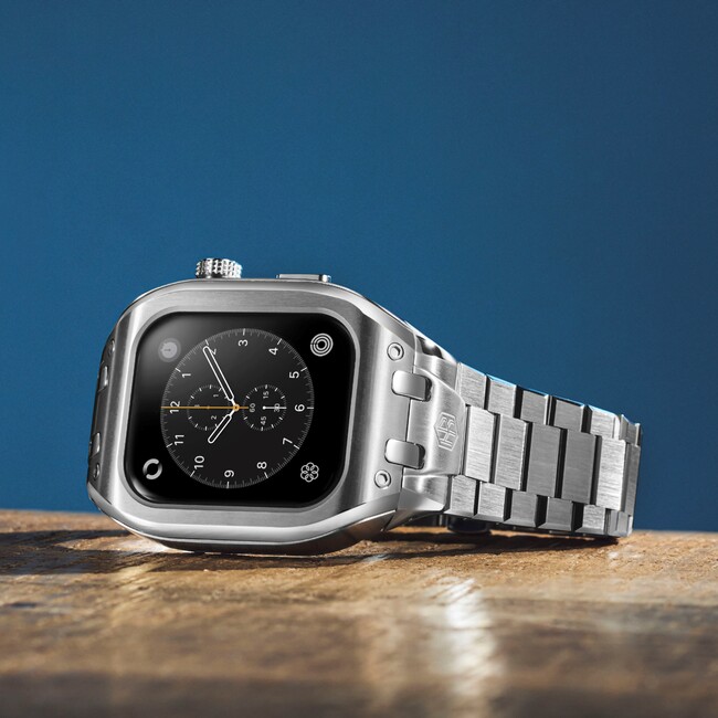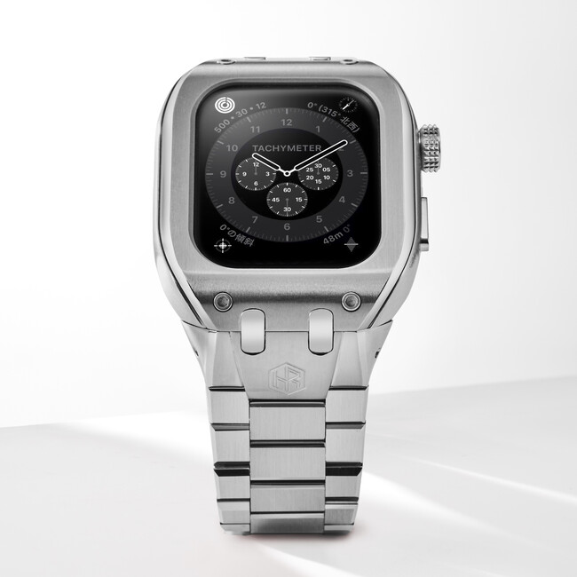 「CLASSIC METAL」は、 「316L」と呼ばれる高級時計や医療器具に使用される高品位の再生ステンレススティールをケースに使用した「クラシック」をベースに、エレガントなブレスレットをセッティングしたアップルウォッチケースです。丁寧に面取りされたステンレススティールが、腕にしなやかに馴染みます。