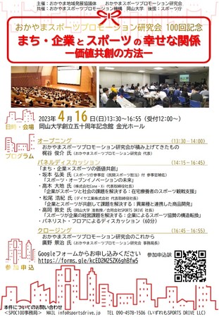 おかやま地域発展協議体おかやまスポーツプロモーション研究会は、発足以来、毎月1回の定例会を積み重ね、2023年4月に100回を迎えます。このことを記念して「まち・企業とスポーツの幸せな関係-価値共創の方法-」(岡山大学共催)と題して、パネルディスカッションを岡山大学創立五十周年記念館金光ホールで開催します。
