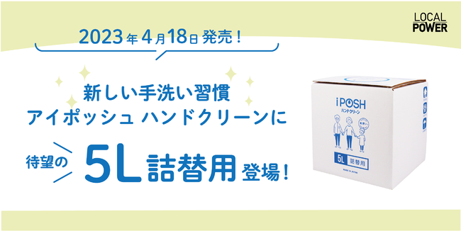 株式会社Local Power(本社:秋田県秋田市・代表取締役:寺田耕也)は、新しい手洗い習慣を提案する「アイポッシュ ハンドクリーン」ブランドに、多くのご要望をうけて詰替用(5L)を追加し、2023年4月18日に全国発売することをお知らせします。