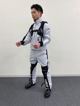 NTT東日本・NTT西日本と共同開発した、電柱建設工事等の掘削作業の負担軽減を目的としたアシストスーツです。約1kgと軽量で衣服のように軽く、作業の動きを邪魔することなく負担軽減を実現しています。