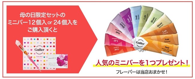 キャンペーン適用条件:指定店舗(Galler(ガレー)公式オンラインショップ、Galler(ガレー)楽天市場店、いいものギフトモノプロ 楽天市場店、いいものギフトモノプロYahoo!ショッピング店)で指定商品(ミニバー12個入母の日ギフトセットもしくはミニバー24個入母の日ギフトセット)の購入が条件