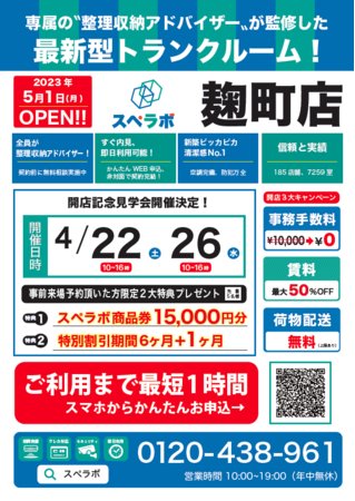 【麹町店/5月1日(月)オープン】見学から契約、解約まで完全非接触・非対面、お申し込みからご利用まで最短1時間!都内、大阪などにて絶賛運営中のトランクルーム【スペラボ】が麹町駅近くに出店!