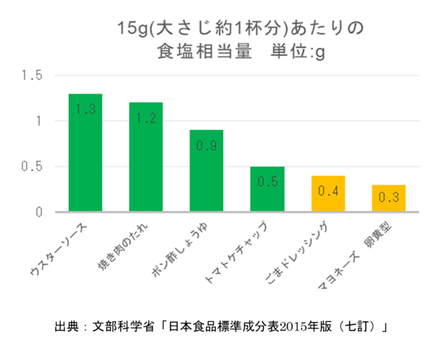 厚生労働省の調査によると、日本人の一日当たりの平均食塩摂取量は目標値を約3g上回っています。マヨネーズやドレッシングは、他の調味料に比べて、食塩相当量が少ない調味料です(右グラフ参照)。また、野菜に多く含まれる「カリウム」は、食塩の取り過ぎを調整するのに役立つため、野菜の摂取量を増やすことは「適塩」につながります。マヨネーズやドレッシングをうまく活用したサラダや野菜料理を提案することで、適切な食塩摂取につながることを期待しています。