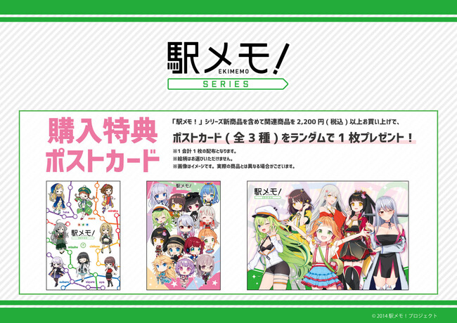 「駅メモ!」シリーズ新商品を含めて関連商品を1会計2,200円(税込)以上お買い上げで、ポストカード(全3種)をランダムで1枚プレゼント。どの絵柄が当たるかはお楽しみです♪